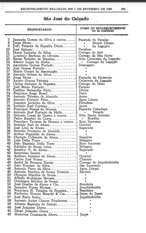 1920. PROPRIETÁRIOS DE TERRA EM SÃO JOSÉ DO CALÇADO. IBGE