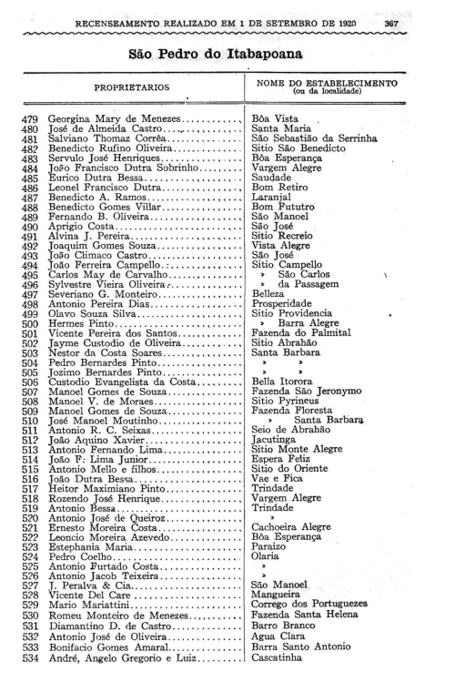 1920. PROPRIETÁRIOS DE TERRA EM SÃO PEDRO DO ITABAPOANA/MIMOSO DO SUL. IBGE
