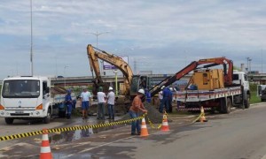 A interdição para conserto acontece a 100 metros do viaduto da Darly Santos no sentindo Vila Velha-Vitória.  As equipes de engenharia da Cesan estão no local para realizar o reparo.